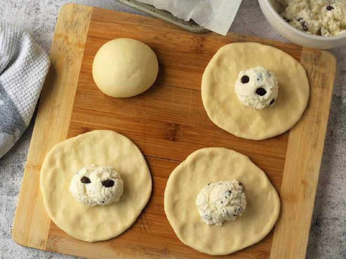 - Use your fingertips to flatten each ball of dough into a circle approximately 5 inches wide. Place about 2 tablespoons of the ricotta mixture in the center of the dough.