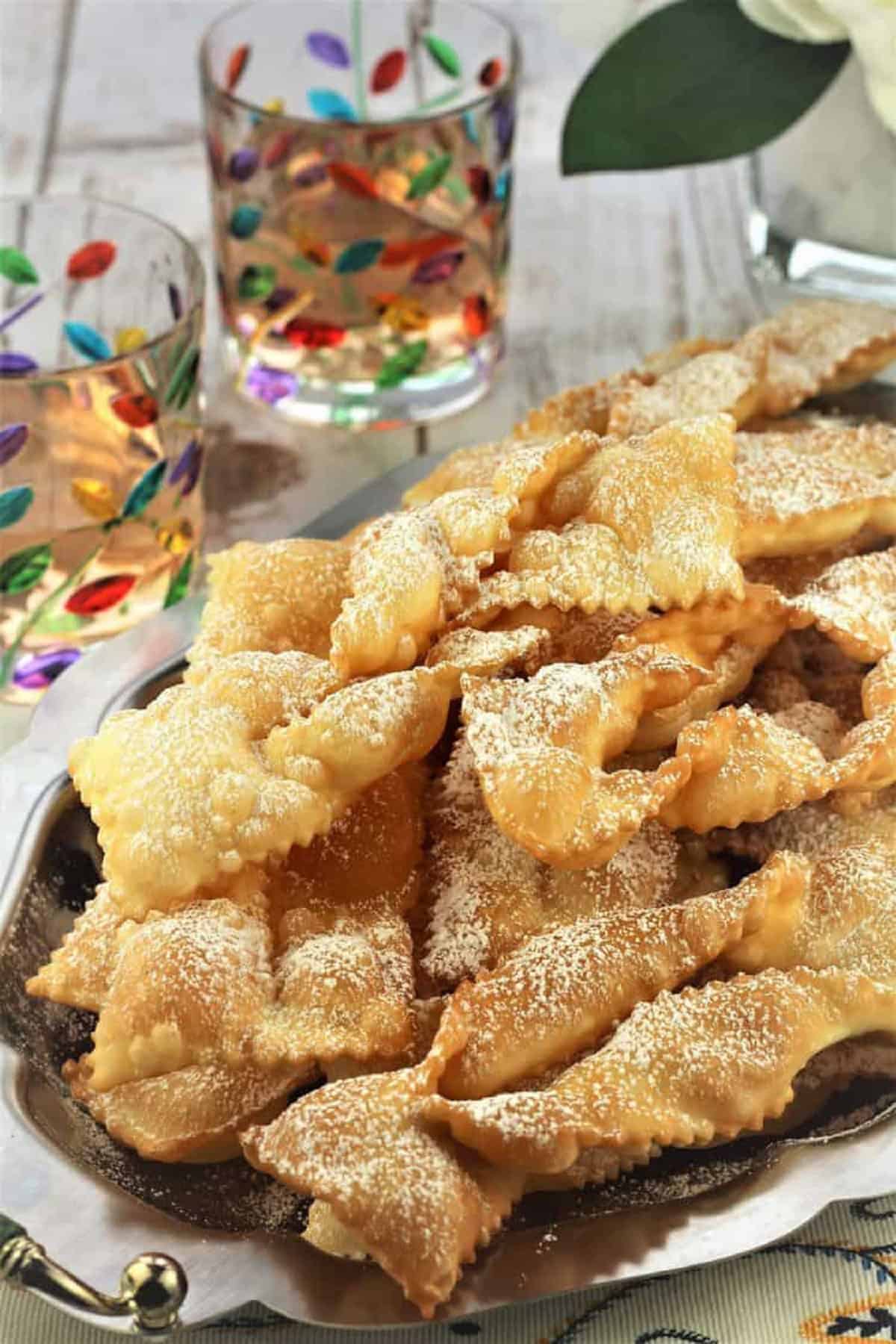 Chiacchiere are called by several different names depending on the region in Italy where they are made. This includes frappe, crostoli, or cioffe to name a few. No matter what they are called the idea is always the same. Thin sheets of dough cut into strips, fried and dusted with powdered sugar.