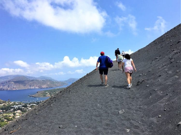 The Eolian islands are a chain seven of islands located off the northern coast of Sicily and visible from Capo D'Orlando. Each island is quite characteristic and distinct from the other and these islands are a popular tourist destination for Sicilians as well. We arrived via hydrofoil from the port of Milazzo, just east of Capo D'Orlando. The main draw of Vulcano is the climb to the crater of the volcano; the stinky sulphurous mud baths and the black sand beaches with bubbling jacuzzi-like water heated underneath by natural gas. As you reach the small part, depending on which way the wind is blowing that day, you may be met with awful sulphurous fumes! Thankfully, we were spared until we reached the mud baths. Now if you're sensitive to strong odors please don't go. We learned this with my son who could not stay in this area at all!