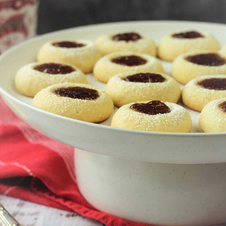 A cookie platter is not complete without a festive looking thumbprint cookie! I made these with almond flour which adds not only flavor to the cookie but a satisfying chewy texture. Top with flavored jam of your choice!