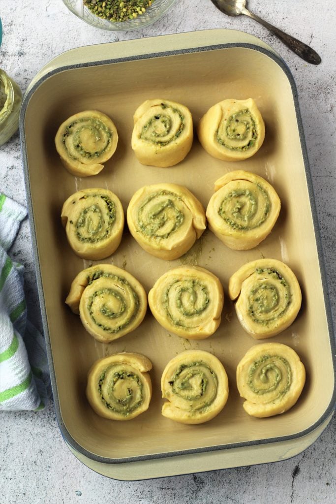 - Before baking, brush the top of each roll with butter and sprinkle the remaining chopped pistachios evenly over them.