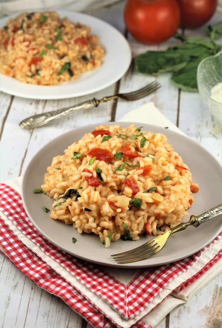 Who says risotto is only a cold weather dish? Enjoy this simple Tomato and Basil Risotto with fresh tomatoes and fragrant basil from your garden for the perfect light summer meal!