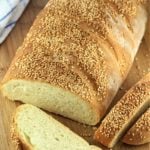 Semolina bread with sesame seeds is quite typical of Sicily. This rustic loaf has a crusty exterior, a pale yellow interior due to the use of semolina flour and is topped with sesame seeds giving it a wonderful crunch and nutty flavor!